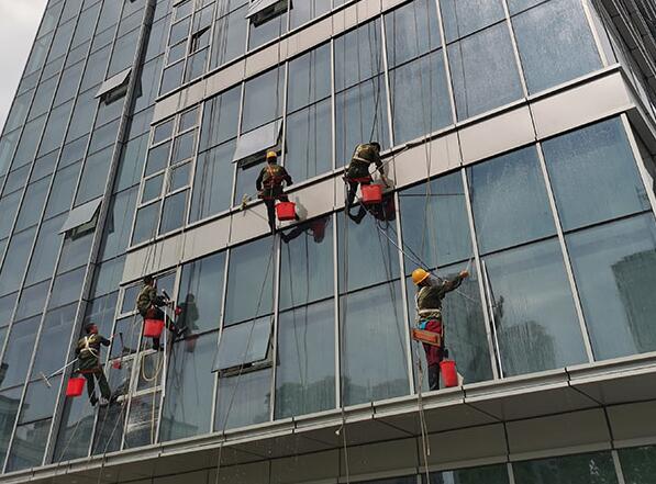 (15)在该建筑物外墙面清洁保养施工现场的地面区域内设安全区域,并应设置阻拦式栏杆和安排地面安全员,禁止行人通行。发现未设安全区域或未设置阻拦式栏杆、地面安全员,则停止工作。